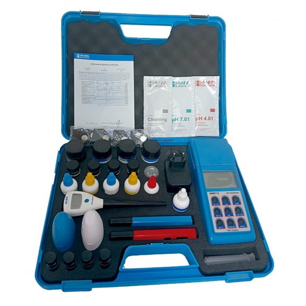 Se suministra con el turbidímetro HI98713, 5 cubetas de medición con tapa, 5 porta-tags con tags, patrones de calibración HI98713-11, aceite de silicona, paño limpieza cubetas, transformador CA. pHmetro HI98107, sobre de solución de limpieza de electrodos, sobre de solución tampón de pH 4,01, sobre de solución tampón de pH 7,01. Minifotómetro de bolsillo para medida de cloro HI701 con reactivo líquido para 100 test, 2 cubetas con tapas, medidor de CE HI98304, termómetro HI98501, minifotómetro de bolsillo para medida de color del agua HI727, discos filtrantes, pilas, instrucciones y maletín de transporte.